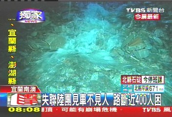 中新網10月22日電 據臺灣TVBS報道,宜蘭大淹水,蘇花公路更是處處坍方,甚至傳出有大陸游客團的游覽車受困。該媒體記者挺進現場,只看到游覽車空車,人員不知去向,不知是否平安;臺九線大約115公里處,部分路段的路基完全被淘空,土石滑落一兩百米的山下,附近路面更變成小溪、不斷淹水。