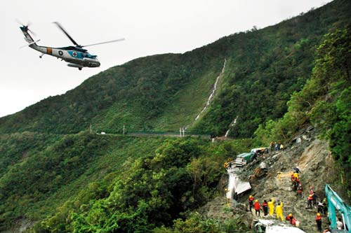 空援同時,臺軍特種作戰部隊、消防部門特種搜救隊都出動,“公路總局”以重型機具清道,只是山坡壁已成泥石漿,才一挖,旁壁的土石又流下,如此重復施作,最后終于勉強清出一條便道。