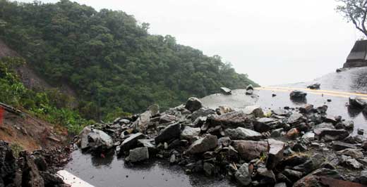 土崩樹倒,大小崩坍至少十多處,山路上黃泥水洶涌,夾雜著大小石塊。山壁上垂泄一條條白瀑,看似美麗,卻暗藏兇險。