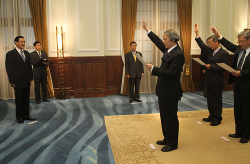 據報道,馬英九25日上午出席新任“司法院”、“考試院”政務人員宣誓典禮,并擔任監誓。宣誓官員包括“司法院長”賴浩敏、“副院長”蘇永欽、“最高行政法院院長”蔡進田、“考試院考試委員”張明珠、“考試院考試委員”高永光、“司法院秘書長”林錦芳、“公務人員保障暨培訓委員會主任委員”蔡璧煌共7人。