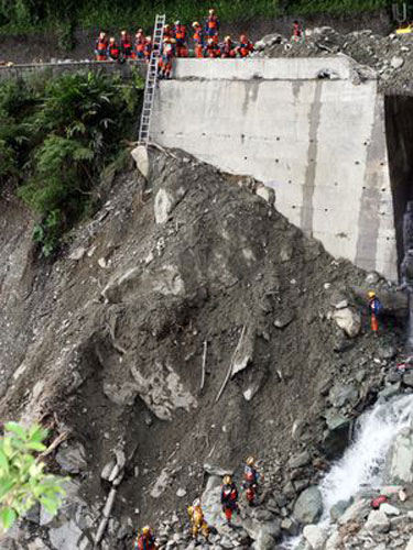 突然一道刺眼車燈從遠方駛近,1輛疾駛的工程車企圖闖過坍塌處,工地人員迅速沖向前,大聲鳴哨;就在哨聲回音未歇之際,一聲轟隆巨響,數(shù)顆大小不等的落石磙落地面,碎裂四射,其中較大的落石不比一個書柜小;慶幸的是,那輛工程車在落石前停了下來。