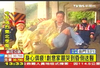 據臺灣TVBS電視臺報道,蘇花公路搜救行動已進入第7天,20名失聯大陸游客的任何消息都牽動著他們家屬的心。焦急等待的心情加上惡劣氣候,使得一名創(chuàng)意旅行社失聯大陸游客家屬在今(27)日中午哭到昏倒,送醫(yī)救治。