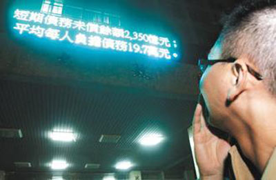 據(jù)報(bào)道,7日傍晚近7時(shí),“財(cái)政部”財(cái)政大樓正門和側(cè)門的電子看板上,以跑馬燈方式秀出“截至2010年11月底,‘中央政府’一年以上債務(wù)未償余額4.32818兆元(新臺(tái)幣,下同),短期債務(wù)未償余額2350億元;平均每人負(fù)擔(dān)債務(wù)19.7萬元”,以電子看板的形態(tài)仿效美國設(shè)置“債務(wù)鐘”。