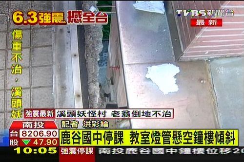 中新網6月3日電 據臺灣TVBS網站報道,6月2日13時43分,臺灣南投縣(北緯23.9度,東經120.9度)發生6.7級地震(臺灣島內氣象部門測定為6.3級),震源深度9.0公里。南投鹿谷中學也受到地震影響,校園內多處毀損,3日停課一天。