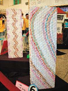 臺南高商廣告設(shè)計商、當(dāng)?shù)亟處焺t與學(xué)生共同創(chuàng)作,提供五項作品參展,分為鳳凰花和安平古堡等造型。府城舊冊店家潘靜竹則以“愛心久久”為題,將發(fā)票箱點(diǎn)綴成美麗少女。