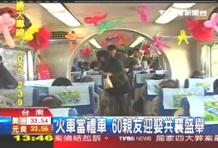 中新網(wǎng)12月8日電 臺灣臺南有一位鐵道迷,為了要完成在火車上結(jié)婚的夢想,自掏腰包花了4萬多元新臺幣,包下臺鐵行政專車,載著60多名的親友,從樹林迎娶新娘回臺南林鳳營站。火車婚禮堪稱臺灣史上頭一遭,月臺上吸引很多乘客目光,也造成轟動(dòng)。