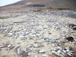 春節以來的嚴重寒害,造成澎湖望安島鴛鴦窟海灘魚尸遍野,整座沙灘全是死魚,師生悲痛稱之“哭泣的沙灘”。(臺灣中國時報圖;洪嬡慧提供)