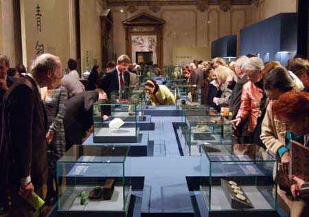 開(kāi)幕典禮結(jié)束后,數(shù)百名來(lái)賓即涌進(jìn)展覽大廳,一睹故宮文物的風(fēng)采。