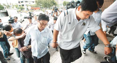 臺灣職棒米迪亞暴龍隊涉嫌打假球,板橋地檢署在偵訊后,暴龍隊老板施建新遭到檢方飭回,教練吳昭輝(右一)、施建新特助郭德志(右二)等六人遭到收押。(圖片來源:臺灣《聯合報》)