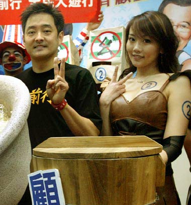 國民黨的全民大游行活動訊息現(xiàn)場邀請模特兒展示游行大隊的主題;民進(jìn)黨的活動上參加活動年輕人在臉上寫“勝”字挺謝長廷。