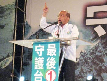民進黨“副總統”候選人蘇貞昌20日在高雄市“最后一席、守護臺灣”造勢晚會批評對手陣營的主張。