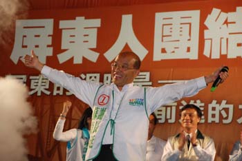 蘇貞昌20日晚在故鄉屏東市造勢,請故鄉人給他溫暖護送他進“總統府”,也呼吁屏東人不要被國民黨的奧步騙走選票。 “中央社”圖