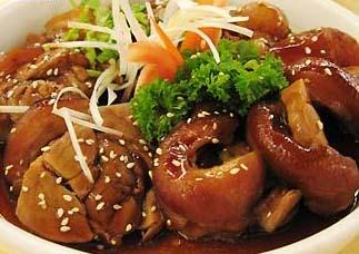 “萬(wàn)巒豬腳”在制作時(shí)不放糖、鹽和味精,只用醬油,豬腳要用10多種草藥和香料腌制,在鹵制時(shí)要把溢出的油汁收干,吃起來(lái)沒(méi)有油膩感。