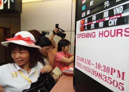兩岸周末包機啟動,大陸赴臺觀光首發(fā)團四日揭幕,第一團從廣東出發(fā)的旅客在抵臺桃園機場時,立刻兌換新臺幣。 “中央社”圖