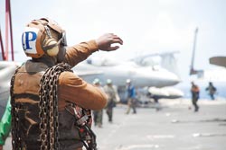 其中身穿黃色制服的是導引官和督導官,負責戰(zhàn)機彈射前的定位和引導工作,當他蹲下用手擺出向前沖的手勢,就代表戰(zhàn)機可以彈射升空﹔白色制服人員則是安全組,負責甲板上人員警戒和安全醫(yī)療﹔穿著綠色制服的是彈射組,負責將戰(zhàn)機前輪固定在航母彈射器上,以及恢復攔截索定位。
