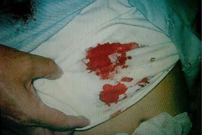 陳水扁露出剛進入醫院治療時的斑斑血跡供院方拍照。