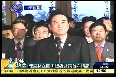 陳云林說,今天我在北京登機的時候,那里的天空晴空萬里,中午我們到達桃園機場的時候,到達圓山飯店的時候,外面是細雨綿綿,和風宜人,它預兆著我們兩會的商談會圓滿成功。