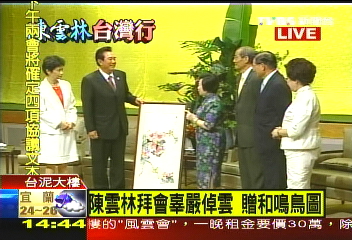陳云林拜會辜嚴倬云,追思辜振甫推動兩岸關系的精神;辜嚴倬云首先贈上張大千的名作“和鳴鳥圖”給陳云林,象征兩岸“合鳴”。
