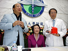臺中市長夫人邵曉鈴(中)17日正式辦理出院,臨行前送給醫療團隊每人一個馬克杯,并在副院長鄭隆賓(右)的紙盒上慎重簽名。 來源:“中央社”