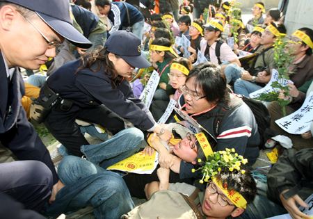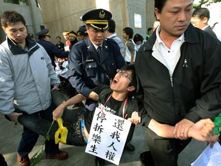 據(jù)臺(tái)灣媒體報(bào)道,抗議者每人手持一枝菊花,并高舉訴求布條,在園區(qū)門前集結(jié)訴求“反迫遷,定古跡”。隨后警方強(qiáng)制驅(qū)離靜坐人士,共有約四十名靜坐者與一名樂生院民被帶往警局。