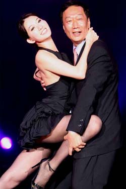 郭臺銘(右)與名模林志玲(左)在去年的晚會上秀一段國標舞,將全場氣氛帶到最高潮。