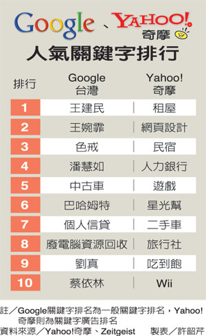 而另一大網(wǎng)絡(luò)搜尋引擎Google發(fā)布的11月臺(tái)灣網(wǎng)友一般關(guān)鍵詞廣告排行榜,前十名幾乎都是王建民、王婉霏、色戒、潘慧如、蔡依林等影視、體育話題人物。不過“中古車”也名列第五名,可見民眾對(duì)于中古車興趣濃厚。