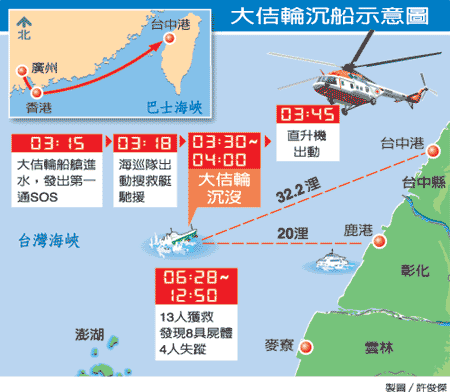 臺灣搜救中心指出,昨天凌晨三時十五分,接獲臺中海巡單位轉報大佶輪發(fā)出求救訊號,即指揮臺中海巡隊出動巡防艇于三分鐘后馳往;凌晨四時,大佶輪完全沉沒,在雷達幕上消失。