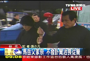 中新網2月3日電 國民黨2008參選人馬英九的岳父日前去世。今天(3日)舉辦公祭,馬英九家人一大早就出門前往殯儀館。家祭的最后,馬英九跪在老丈人遺體面前,感性地表示自從和周美青結婚后,讓周美青相當委屈,也感謝老丈人多年來在背后的支持。