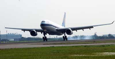 兩岸周末包機4日啟動,南方航空公司自廣州至桃園的首航包機,上午八時五分左右降落桃園機場。 “中央社”圖