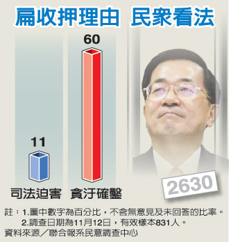 中新網(wǎng)11月13日電 臺檢方聲押陳水扁,臺北地方法院合議庭裁定對其收押禁見,引發(fā)卸任領(lǐng)導(dǎo)人戴手銬、法警打人爭議。臺灣《聯(lián)合報(bào)》民意調(diào)查發(fā)現(xiàn),僅28%臺灣民眾主張給予陳水扁卸任領(lǐng)導(dǎo)人禮遇,只有8%民眾相信法警打人。而逾六成民眾認(rèn)為陳水扁被收押是因?yàn)樨澪凼伦C確鑿,僅11%民眾主張是司法迫害。