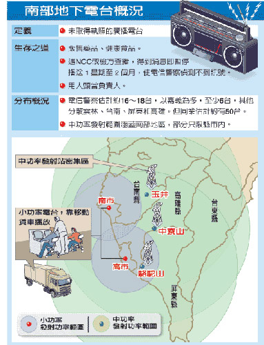 吳姓業者說,地下電臺發射塔多架設在高雄縣中寮山區,這里有合法電臺發射塔,可利用合法掩護非法;其次高雄電信警察距中寮山約一個多小時車程,上山路況又不好,“執法單位久久才會跑一趟”。