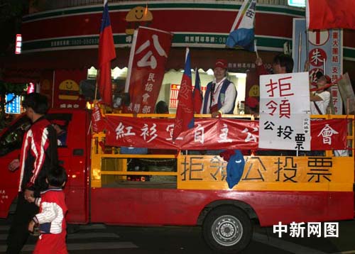 第七屆臺灣“立委”選舉12日舉行。圖為11日晚,紅衫軍在掃街催票時訴求拒領“公投”票。中新社記者 陳立宇 攝