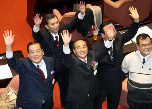臺灣地區第七屆“立法院”二月一日選舉“立法院長”,中國國民黨籍“立委”王金平(前左二),以85票對27票打敗對手,確定連任“立法院長”,中國國民黨籍“立委”曾永權(前左一)則高票當選“副院長”。(“中央社”圖;郭日曉攝)