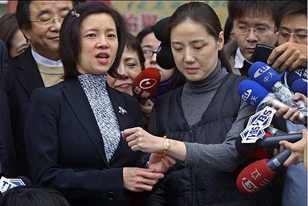 前臺灣《獨家報導》發行人沈嶸(右)因雜志附贈璩美鳳性愛光盤一案遭判刑二年,經服刑三百六十四天后于二十六日假釋出獄。光盤主角璩美鳳盡釋前嫌,親自前往桃園監獄迎接沈嶸。圖為沈嶸與璩美鳳緊握雙手,在媒體的包圍下離開監獄。圖:臺灣《中國時報》