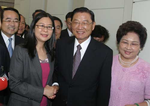 海基會(huì)董事長(zhǎng)江丙坤(中)十一日啟程前往北京與海協(xié)會(huì)展開(kāi)中斷九年的協(xié)商,臺(tái)灣“陸委會(huì)”主委賴幸媛(前左)前來(lái)送機(jī)。( “中央社”圖)