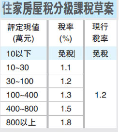 根據“財政部”所擬草案,房屋評定現值在10萬元以下者,仍維持免稅;超過10萬元以上的住家用房屋,房屋稅將分為五級課稅,稅率分別是1.1%、1.2%、1.3%、1.5%及1.8%。