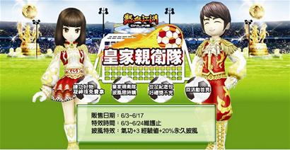 臺灣網(wǎng)游廠商也夠聰明,他們推出了應(yīng)景的世界杯風(fēng)格裝備產(chǎn)品。目前臺灣最熱血的武俠網(wǎng)游非華義旗下的“熱血江湖”莫屬。6月正值該游戲的改版升級階段,游戲服務(wù)商就順勢將6月打造成了“世足月”。其中最令球迷玩家興奮的就是,游戲地圖中將新增綠茵場為全新場景,游戲裝備也同步推出新款披風(fēng)“皇家親衛(wèi)隊”。這款披風(fēng)除了可以幫助玩家增加經(jīng)驗值、氣功攻擊力之外,還能讓玩家為自己喜愛的球隊加油打氣,在游戲中體驗拉拉隊的歡樂氛圍。(導(dǎo)報記者 燕子 綜述)