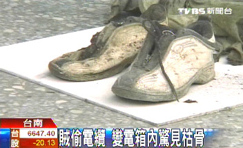 據臺灣TVBS電視臺報道,臺南縣一名小偷潛入歇業的工廠偷電纜,意外發現變電器箱里竟有一具白骨。據臺灣警察分析,死者可能是要偷電纜意外觸電,死亡時間超過2年;發現白骨的竊賊,也因為留在現場,通緝犯身份曝光,被帶回警局。