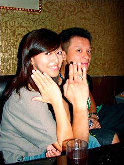 求婚成功,男女主角林育圣、李宜蕓開心一起秀戒指。