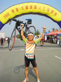張炳榮昨天參加屏東東港大鵬灣51.5公里全臺鐵人三項競賽,先游泳1.5公里,再騎自由車40公里,最后跑10公里,3小時7分的成績完成比賽。超級鐵人三項協會被他的毅力和精神感動,昨天頒給他榮譽VIP獎。