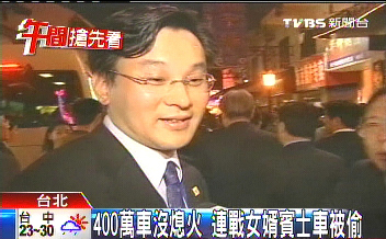 中新網(wǎng)5月1日電 據(jù)臺(tái)灣TVBS報(bào)道,國(guó)民黨榮譽(yù)主席連戰(zhàn)的女婿、連惠心丈夫陳弘元的奔馳車(chē)被偷,消息也登上新聞版面。陳弘元是和妹妹到新竹拜訪(fǎng)易經(jīng)老師,司機(jī)趁空檔,到超商繳費(fèi)而沒(méi)熄火的時(shí)候,原價(jià)400多萬(wàn)的奔馳車(chē),被歹徒乘機(jī)偷開(kāi)走。