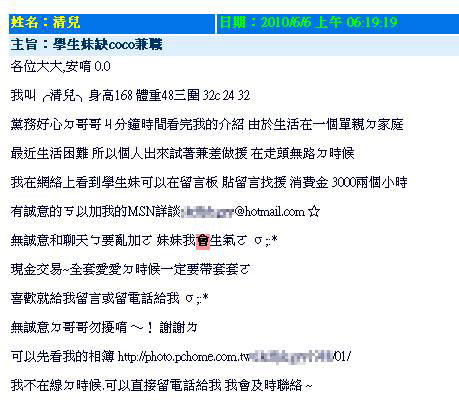 據報道,來到高雄縣教師會網頁,點進留言板流覽,為人師表的空間怎么會有一則“援交”廣告?廣告上頭不但自稱是大二學生,還“男女不限”,因為缺錢,希望大家“援助”。