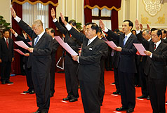 中新網9月10日電 據“中央社”報道,臺當局新任“行政院長”吳敦義今天下午率全體“閣員”在“總統府”宣誓就職,司儀逐個唱名名單,馬英九逐一對鞠躬“閣員”回禮。
