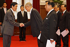 馬英九隨后并一一和吳敦義、廖了以、朱立倫與“政務首長”握手,與會人士在儀式結束后,相互寒暄。