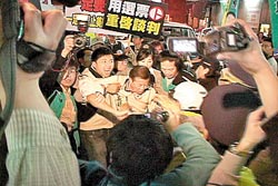 當(dāng)時馬英九步行,沿路與商家住戶打招呼,拜托支持邱鏡淳,這個時候民進(jìn)黨提名候選人彭紹瑾,也在謝長廷陪同下從學(xué)府路往建新街方向掃街。
