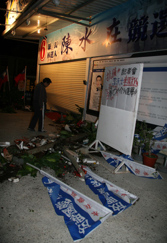 金門縣長候選人陳水在競選總部,29日深夜遭另一位縣長候選人許敬民駕駛宣傳車沖撞,現場一片狼籍,幸無人受傷。許敬民被警方逮捕漏夜偵訊。 “中央社”圖