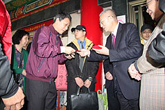 吳敦義在拈香祝禱期間,在大佛風(fēng)景區(qū)內(nèi)的大雄寶殿廣場(chǎng)旁親自種下菩提樹,并發(fā)放888個(gè)福袋給前來游玩的民眾。