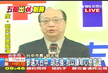 中新網(wǎng)5月13日 據(jù)臺灣TVBS電視臺報道,國民黨中常會昨天通過“五都”市長提名征召人選,藍(lán)營年底選戰(zhàn)五虎將正式就戰(zhàn)斗位置。爭取大臺中市長的胡志強(qiáng),今日上午召開記者會,正式對大臺中市民表態(tài)參選。他表示將以最謙卑的心情,來參選大臺中市長。