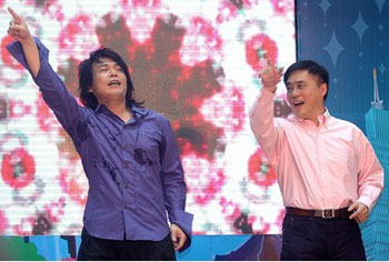 中新網5月19日電 據“中央社”報道,臺北市將舉辦花卉博覽會,藝人伍佰19日身披紙制環!疤諔鹁b”化身“i花博”環保親善大使,與臺北市長郝龍斌大跳招牌花朵舞。伍佰高唱“你是我的花博”,強調愛地球、做環保,要“不眠也不休”。