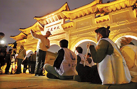 臺(tái)灣當(dāng)局“教育部”計(jì)劃拆除臺(tái)北中正紀(jì)念堂前的“大中至正”牌匾,引發(fā)當(dāng)局與臺(tái)北市政府之爭(zhēng),第三社會(huì)黨發(fā)起人周奕成(坐地左一)等成員組成“維和部隊(duì)”四日晚間到場(chǎng)靜坐呼吁藍(lán)綠停止惡斗,暫停拆除。臺(tái)灣《中國(guó)時(shí)報(bào)》圖 姚志平 攝